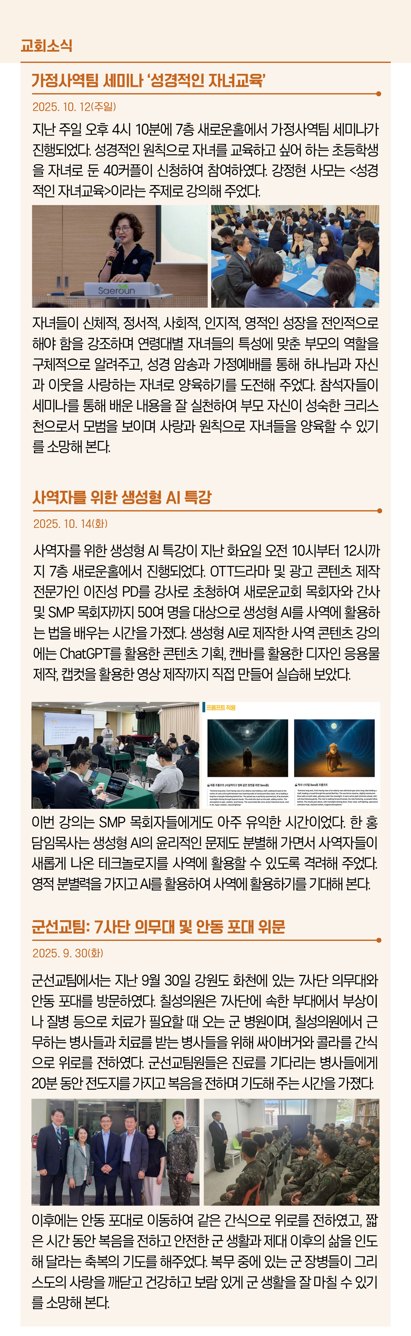 •가정사역팀 세미나 •사역자를 위한 생성형 AI 특강 • 군선교팀: 7사단 의무대 및 안동 포대 위문(2025-10-19)
