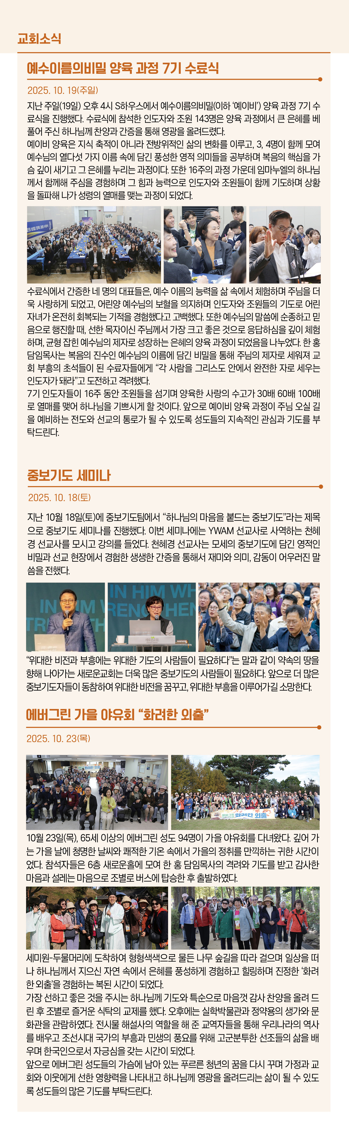 •예수이름의비밀 양육 과정 7기 수료식 •중보기도 세미나• 에버그린 가을 야유회 “화려한 외출”(2025-10-26)