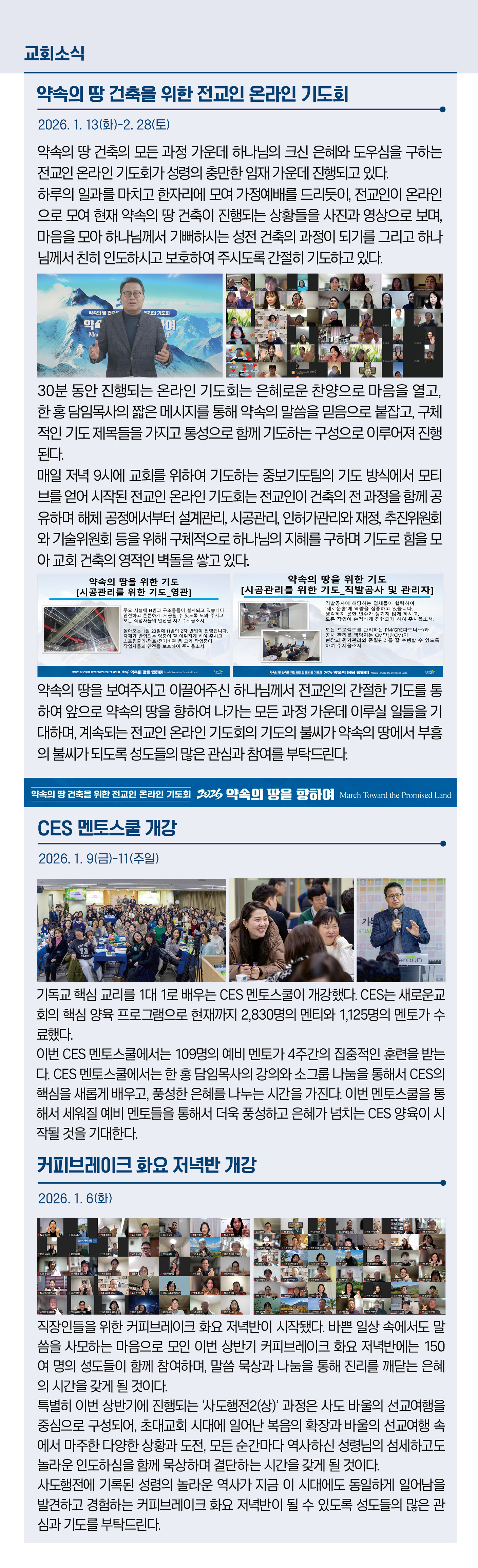 •약속의 땅 건축을 위한 전교인 온라인 기도회 •CES 멘토스쿨 개강 •커피브레이크 화요 저녁반 개강(2026-01-25)